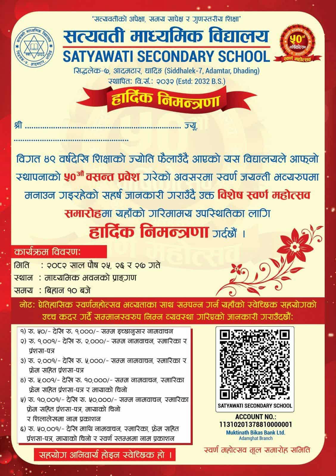 Satyawati Secondary School (सत्यवती माध्यमिक विद्यालय) is a well-established community-based educational institution located in Adamtar, Siddhalek Rural Municipality, Dhading District, Bagmati Province, Nepal. Established in 2032 B.S. (1975 A.D.), the school has been serving the local community for decades with a strong commitment to quality education and holistic student development.